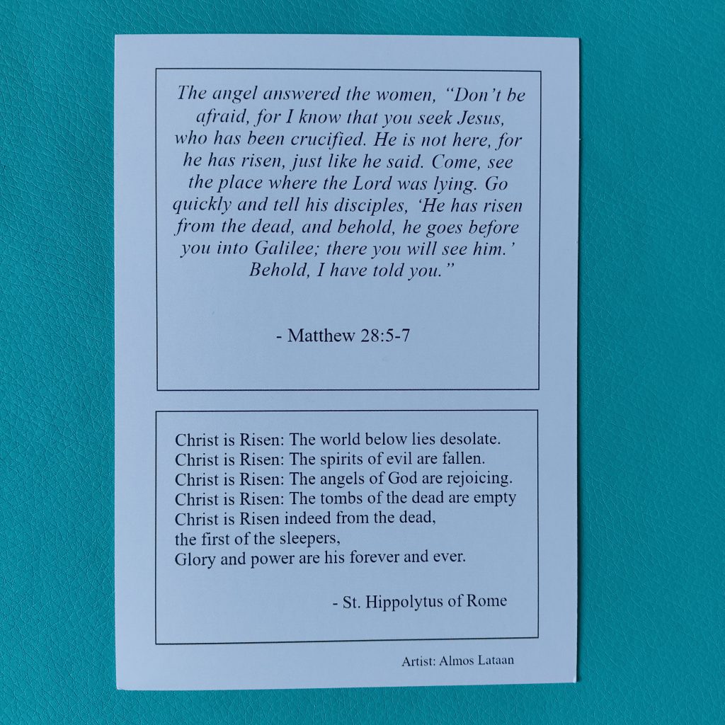 Of course, the primary purpose of a prayer card is one of devotion, and so the text included is of paramount importance. For this card, the scripture reference chosen was Matthew 28: 5-7.